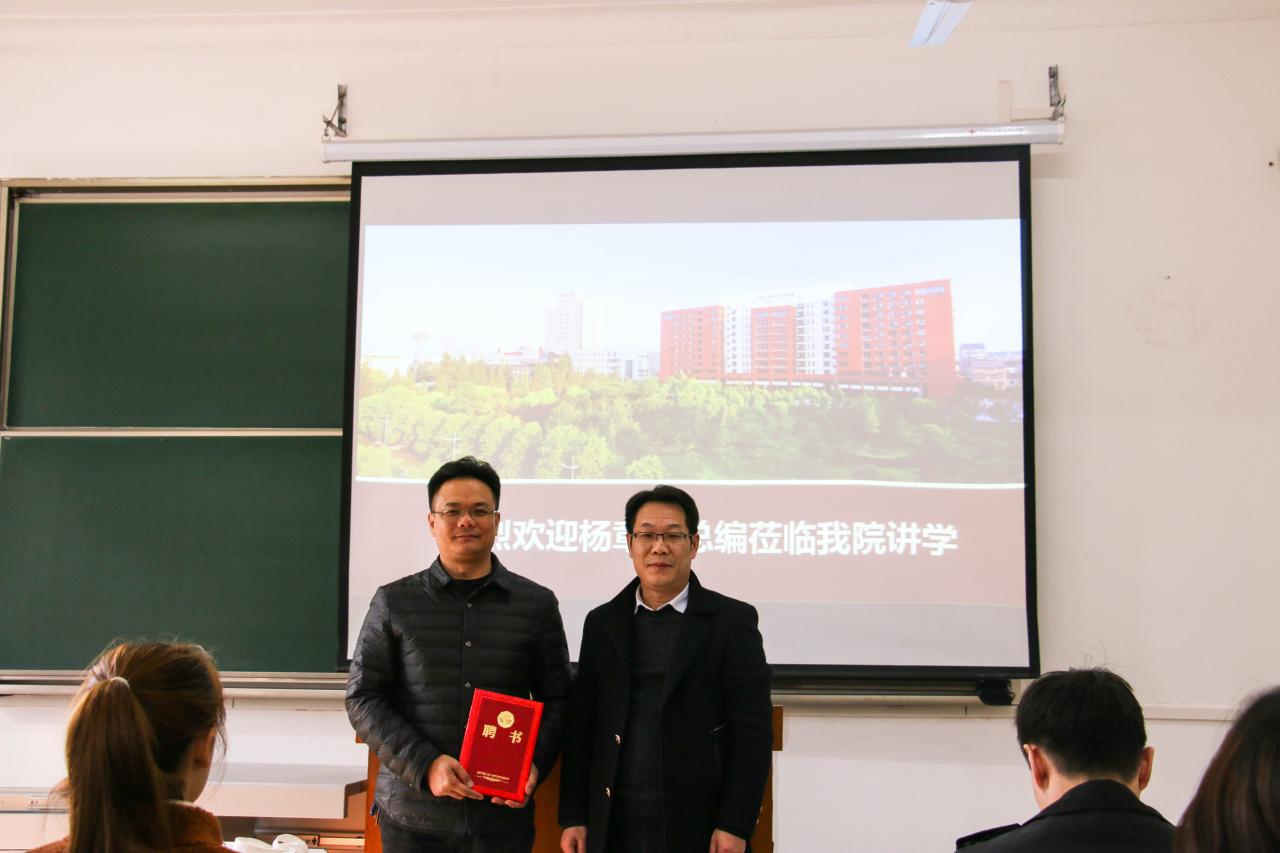 讲座开始之前,举行了简短的客座教授聘任仪式,由何世龙院长向杨章池主编颁发了聘书。接着,杨章池从六个方面开始他的讲座,他先结合数首诗歌,展示诗歌与我们的精神世界的紧密联系及诗歌怎样在当代社会中进行发声。然后他对新时期20年来诗歌发展中的重要事件,如“盘峰论争”、诗坛英雄排行榜及“梨花体”等进行了盘点。杨主编重点介绍了自己关于如何构建好诗的认识——构建好诗的六组要件:求小、求细、求重、求清、求近、求异,并带领同学们欣赏相应诗歌。讲座中,杨主编结合自己的创作经验,讲述诗歌是怎么来的,他说“诗歌是活出来的,看出来的、听出来的、摸出来的、读出来的……总之是感出来的”,“要做一个有心人”,他以自己的诗歌作品《古文人:理发师》《阳光现在沙拉碗上》《公交车独语》《姨婆和大姑》等,讲述自己的生活经验和创作灵感,让同学们懂得诗歌是来自生活的、是靠悟出来的!在最后的交流环节,杨主编还回答了同学关于如何创作新诗的问题。