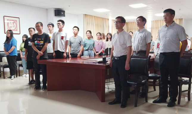升国旗仪式结束后,文学院党委中心组成员杨克非书记、余劲东副院长、胡世先副书记、陈娟老师、徐东老师陪同假期留校的学生党员、入党积极分子、学生干部代表和2019级新生分别于东、西校区观看国庆阅兵仪式。当五星红旗在天安门广场上再次升起之时,全场师生情不自禁的再次起立,高唱国歌,表达对祖国母亲的深情与热爱。