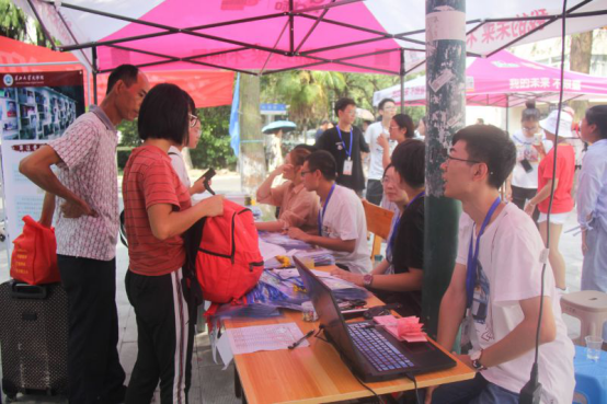 在学院报到注册点的现场,志愿者们来回穿梭,引导新生完成注册手续、帮拿行李、带领新生熟悉宿舍情况与校园环境。