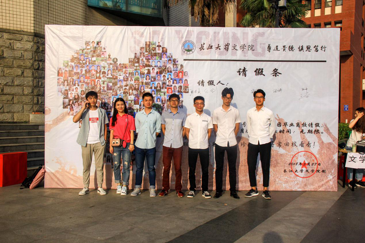 6月6日上午7时许,文学院300多名毕业生前往12教405学术报告厅参加学士学位授予仪式。12教前立着一张长5米宽3米的“请假条”,“请假条”的左侧是文学院300多名毕业生的照片,右侧是一张“离校请假条”。旁边还设立有毕业生纪念品发放点,将精心设计的书签等纪念品送给毕业生。途径12教的毕业生纷纷在“请假条”前合影留念,并签上自己的名字以表不舍之情。