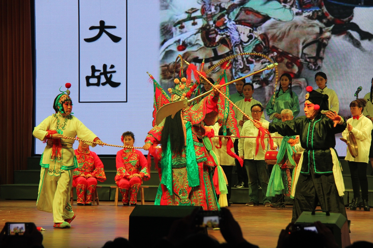 晚会在程立斌、白林等老艺术家们带来的民乐演奏《步步高》、《风吹荷花》中拉开序幕,鼓声与京胡、高胡等交相辉映,余音绕梁,令人陶醉。由长江非遗学社社员们带来的小品《荆河戏曲进校园》将荆河戏的历史娓娓道来,带领观众进入戏曲的殿堂。由黄文玉出演的《四郎探母》选段“见娘”讲述了战乱年代为保卫家国,杨四郎英勇杀敌却无计过关见老母亲的故事。一句“一见我的四郎儿,娘的泪满腮,杨四郎我的儿,我的,我的,娇儿”唱出佘老太君一把辛酸泪,让人动容。