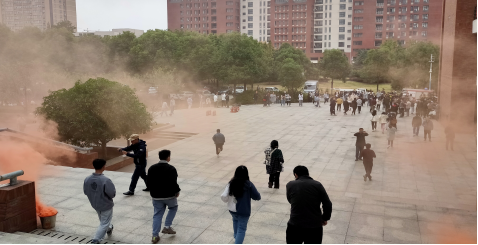 演练现场,模拟火情发生后,保卫处工作人员指挥现场人员有序疏散,迅速到达指定的安全地点。
