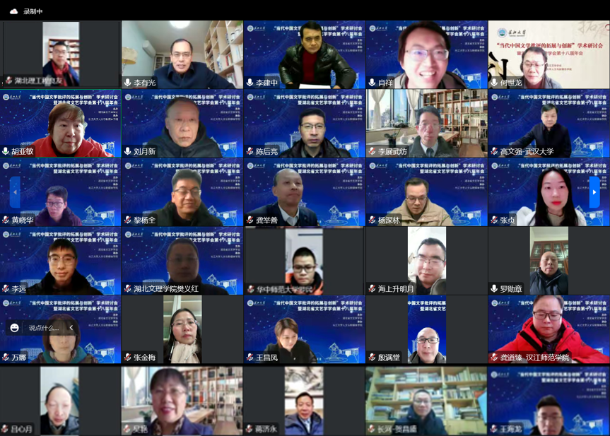 2022年12月31日,由湖北省文艺学学会主办,我院承办的“当代中国文学批评的拓展与创新”学术研讨会暨湖北省文艺学学会第十八届年会成功举行。本次会议旨在进一步构建当代中国文学批评的学术体系和话语体系,促进文学批评理论与实践的发展。来自华中师范大学、武汉大学、华中科技大学、中南民族大学、中南财经政法大学、湖北大学、江汉大学、三峡大学、武汉纺织大学、湖北文理学院、湖北工程学院等省内高校的百余名学者相聚云端,探讨当代中国文学批评理论的拓展与创新。