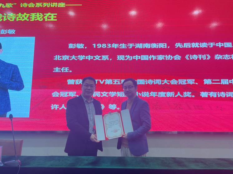 (通讯员 归航 牟群瑶) 3月30日,《诗刊》杂志社编辑部副主任、中央电视台《中国诗词大会》第五季冠军、《中国成语大会》第二季冠军彭敏,武汉市文艺评论家协会副主席、williamhill中文人文学院客座教授刘诗伟应邀来我院,担任首届楚文化节“九歌”诗会系列讲座主讲嘉宾,为全院师生带来三场精彩的诗歌讲座。讲座分别由我院院长何世龙、党委书记杨克非、中文系主任秦鹏举主持。院长何世龙为彭敏颁发我院客座教授聘书。