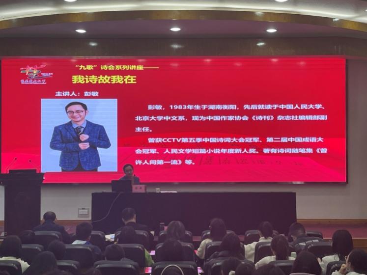 30日上午,彭敏以“我诗故我在”为题开讲。讲座中,彭敏以张若虚的《春江花月夜》切入,认为读诗词给了我们的心灵一个短暂栖息之地,能够安抚我们内心的伤痛,治愈我们生活的平庸无聊。他鼓励同学们多到诗的世界里走一走,感受李白的“长风破浪会有时,直挂云帆济沧海”, 苏轼的“竹杖芒鞋轻胜马,谁怕,一蓑烟雨任平生”……最终达到积学储宝、舌灿莲花的能力素养和人格感召、心性养成的人生境界。彭敏还为同学们讲解了现代诗的不同表达方式,强调在现代诗的创作中要做到立身先须谨重,文章且须放荡,面对社会规训,在思想上适当地逸出。
