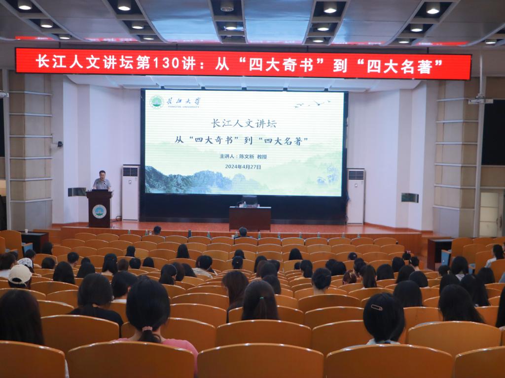 (通讯员 邱雨霏)4月27日下午,我院在12教405报告厅顺利举行长江人文讲坛第130讲。本次人文讲坛,特邀教育部重点编写教材《中国古代文学史》首席专家,武汉大学陈文新教授作题为《从“四大奇书”到“四大名著”》的讲座。本次讲座由william威廉中文院长何世龙主持,教师和学生共计200余人参加。