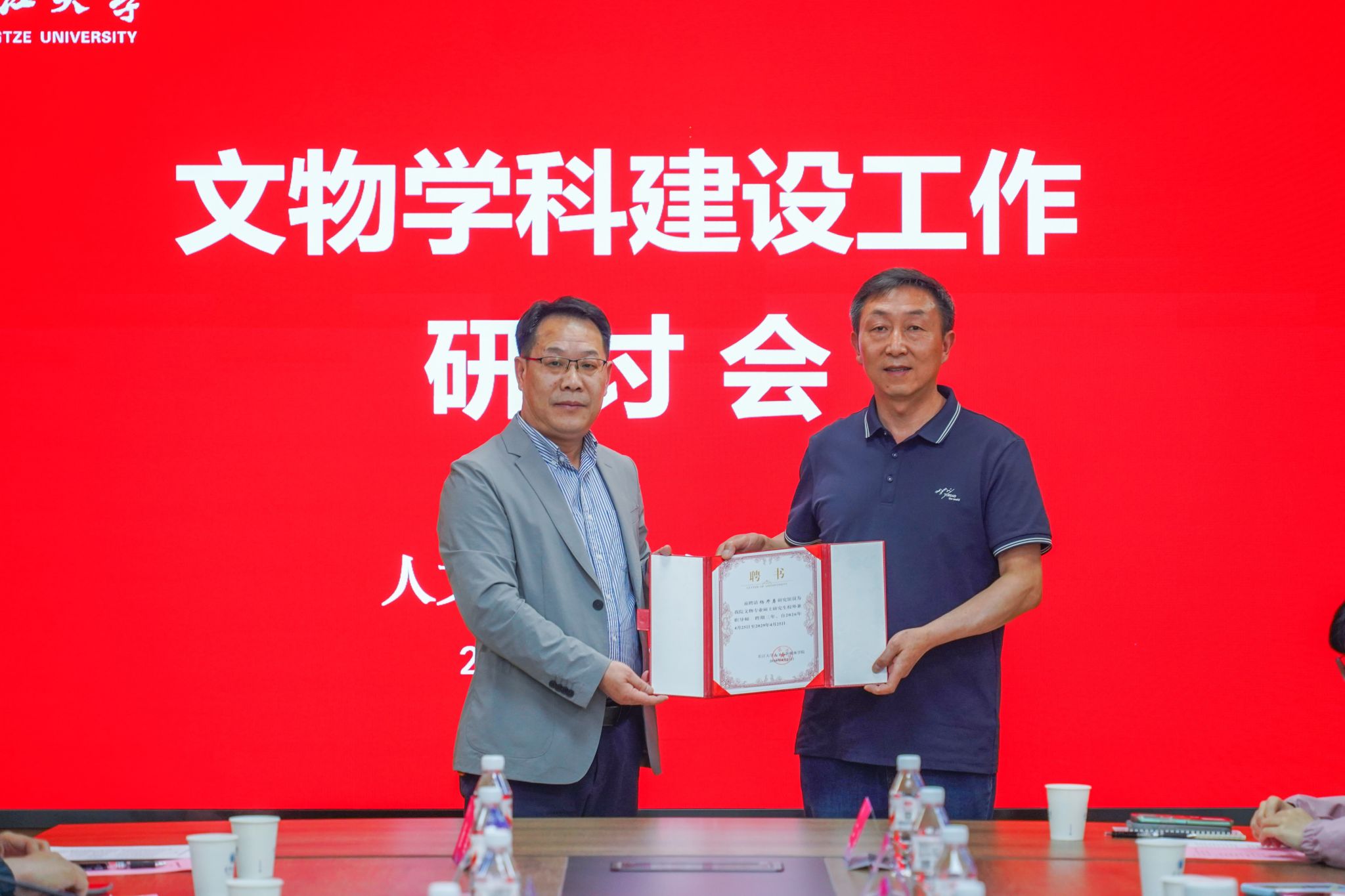 会议伊始,学院举行校外兼职导师聘任仪式,聘请华中师范大学历史文化学院楚学研究所所长宋亦箫教授、荆州市文物保护中心主任方北松研究员、荆州博物馆馆长杨开勇研究馆员,担任我校文物专硕校外兼职导师,进一步充实导师队伍,强化校地合作和产学研协同育人体系。