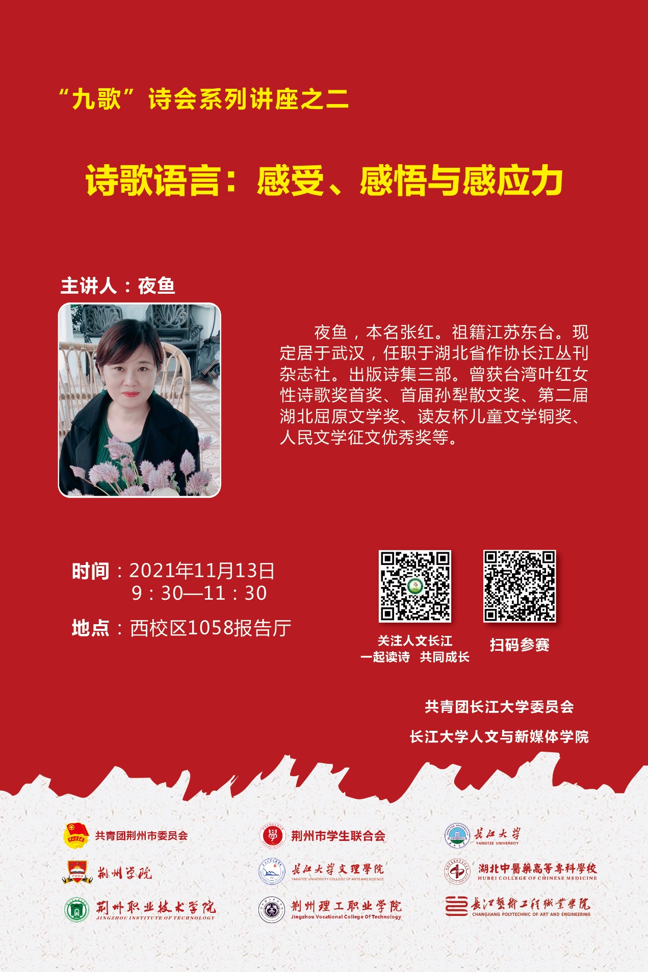 主 题:诗歌语言:感受、感悟与感应力 时 间:2021年11月13日9:30—11:30 地 点:西校区1058报告厅 主讲人:夜鱼