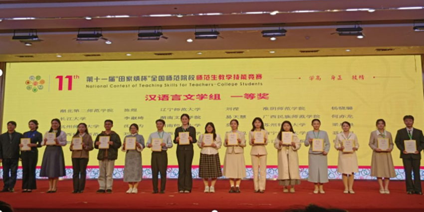 2025年11月28日到11月30日,第十一届“田家炳杯”全国师范生教学技能竞赛决赛在浙江师范大学举办。在我院章芳老师、徐思雨老师、袁飘老师的全程指导下,我院学生李淑琦凭借扎实的专业素养、创新的教学设计和稳定的现场发挥,历经多轮激烈角逐,最终从全国各高校优秀选手中脱颖而出,荣获一等奖。